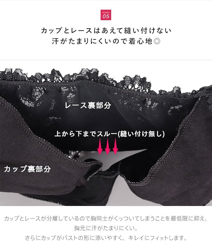【カップとレースはあえて縫い付けない 汗がたまりにくいので着心地◎】カップとレースが分離しているので、胸同士がくっついてしまうことを最低限に抑え、胸元に汗がたまりにくい。カップがバストの形に添いやすく、綺麗にフィットします。カップ裏は、肌にやさしい綿100%素材だから着心地抜群。