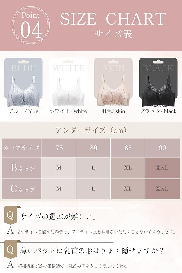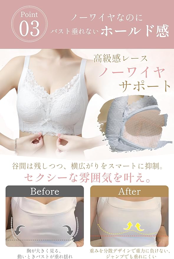 「日本人女性骨格データベース」を基に開発した、カップ厚みを抑え、小胸の視覚効果を実現!超薄型パッドはブラジャー全体的な厚さと重さを減って、より胸が小さく見せる。3段階の圧力制御設計が、リンパなどの流れを阻害せずに理想的なバストポジションを形成します。
