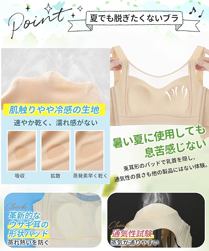 【兎耳形のパッド・超通気性 ブラ】胸が小さく見せるブラの兎耳形のパッドで乳首を隠し、通気性の良さも他の製品にはない体験。一般的なブラジャーパッドに比べ、小さくて可愛いパッドは蒸れ熱いを防ぐので、暑い夏に使用しても息苦感じない。胸が小さく見せるブラ上部がレース素材を使用し、抗菌防臭効果も優秀、セクシーな雰囲気も演出!小さく見せるブラ衛生面も心配なく、表生地速やかな吸湿放熱性は汗ジミによる肌のかゆみやチクチク感も軽減され小さく見せるブラです。