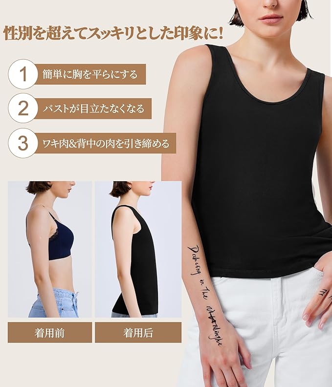 5:自信を呼び覚ますデザイン:このキャミソールを纏うことで、胸が自然に小さく見え、スタイルが一新されることで、あなたの中の自信が目覚めます。男装時も、コスプレも、すべてがもっと楽しくなる。この補正トップスは、ただのアイテムではなく、あなたの自信を高める強力なパートナーです。