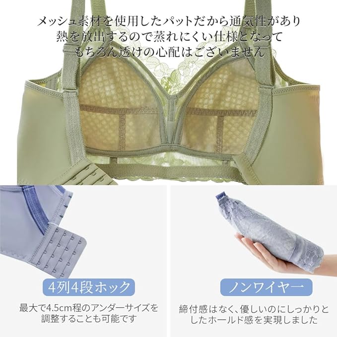 【ノンワイヤーでストレスフリー】ノンワイヤーとソフトな薄めのカップでバストは柔らかくな着け心地、メッシュのように裏が通気性がよく蒸れにくい設計でいつでも快適に着用できます。着用すれば、大きな胸を小さくキレイな形に整えるから、胸が大きいせいで諦めていたびったりしたトップスやニット、綺麗めのワンピ一スだって着こなせます。