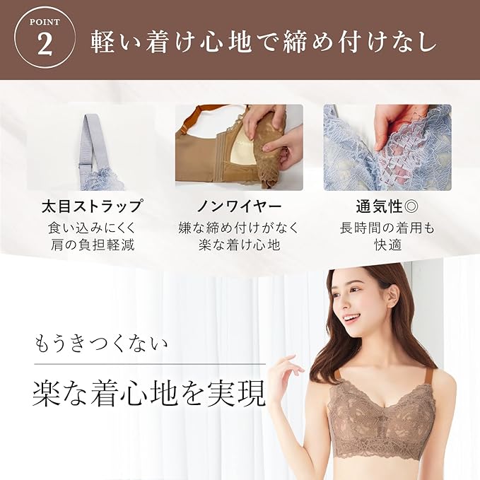 【ノンワイヤーで快適な着け心地】毎日使いやすいラクなフィット感でストレスフリー。通気性の良いレース素材で蒸れにくく、オールシーズン快適な着心地。