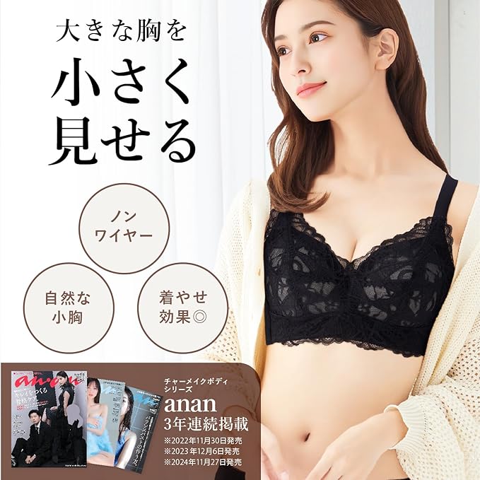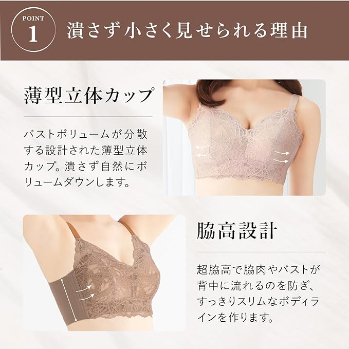 【大きな胸を自然に小さく見せるブラ】ふんわりフィットしながら、自然なボリュームダウンを叶える設計。