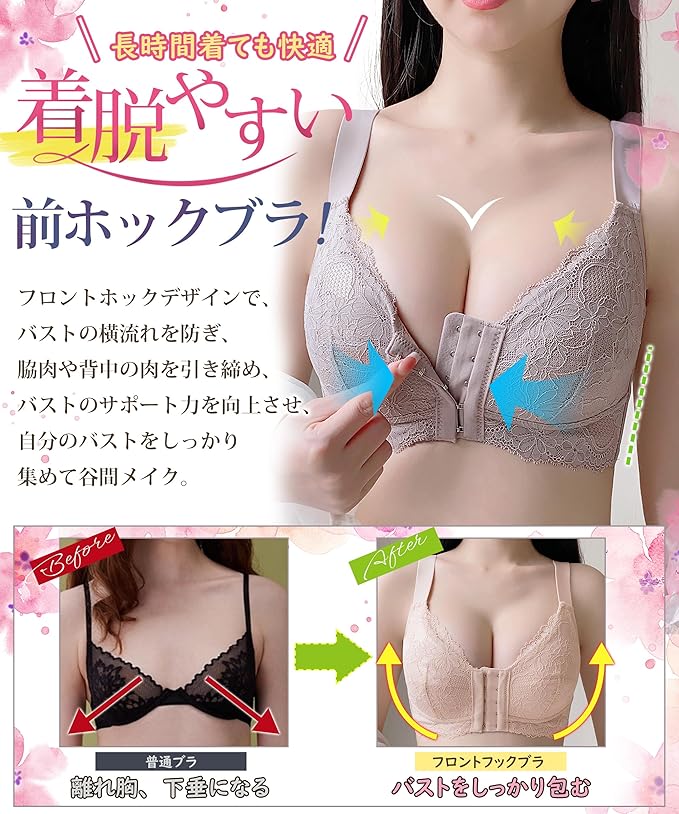 【フロントホック設計・幅広肩紐】 フロントホックブラジャーで、バストの横流れを防ぎ、脇肉や背中の肉を引き締め、バストのサポート力を向上させ、自分のバストをしっかり集めて谷間メイクします。幅広肩紐で肩への負担を軽減し、垂れた胸を持ち上げるブラジャーです。胸を小さく見せるブラはユニークな前ホック設計で、垂れた胸をしっかり支え、授乳時・手が届かない場合など簡単に外して悩みを解消!!バストを逃がしにくく、着けたまま長時間しても快適な前ホックブラです!