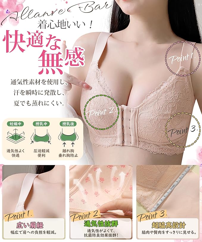 【優れた通気性・驚い安定感】 ハニカム構造の通気性素材を使用し、汗を瞬時に発散し、夏でも蒸れにくいフロントホックブラです。ブラジャーは抗菌防臭加工も施されているので、一日中快適でサラサラな着心地が保たれます。胸を小さく見せるブラが胸全体を包み込み、安定感をさせ、手を上げてもブラがカップからはみ出さないです。胸の大きい女性のために設計されていて、大きいサイズを選ぶことができて、バストを大切にする授乳ブラですよ~