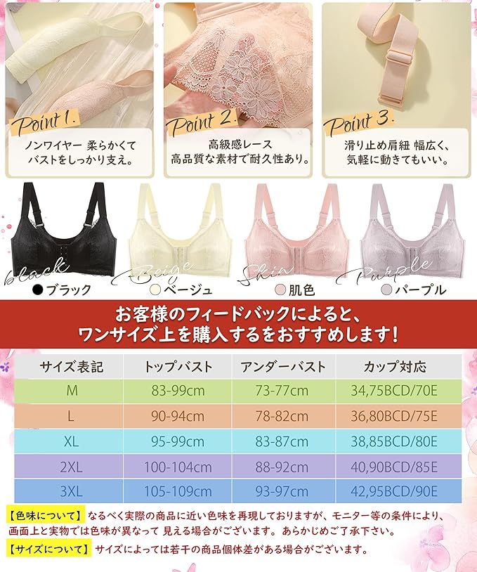 【胸を小さく見せ・着痩せ効果】 着けたら瞬間着痩せ胸を小さく見せるブラです!ブラジャーはノンワイヤー薄型パッドで、大きな胸もスッキリ細見せることができます。フロントホックブラは本来のバストが自然に近い形で収まる特殊設計で、バストを小さく見せるだけでなく、バストを支えて、どんな動きもフィットし、しっかりホールドです。胸を小さく見せブラはフルカップを採用して、バストの揺れによる不快感を効果的に軽減できて、よく胸を抑えてくれるけど、潰しすぎないし、痛くもない前ホックブラ。