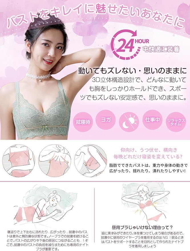 [veimia] ノンワイヤーブラ ナイトブラ 昼兼用 ぶら【無縫製 レース 美胸 締付け感なし 通気性】垂れた胸補正 脇高設計 胸を小さく見せる 着痩せ 可愛くて見栄えのするノンワイヤータイプ | oioioichan