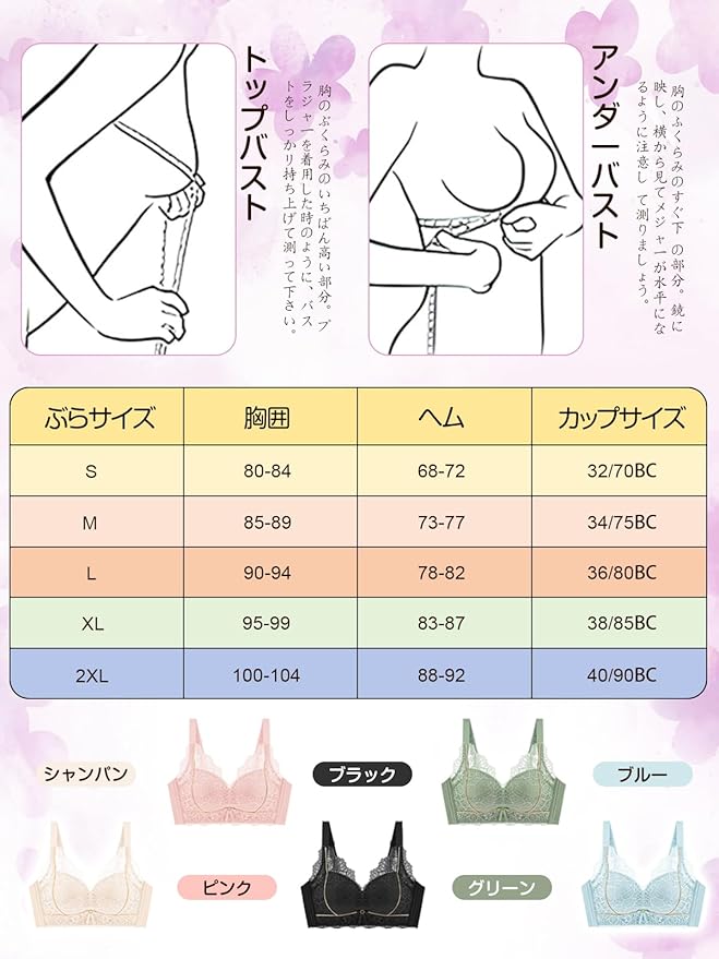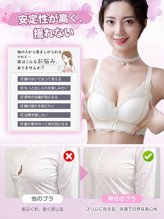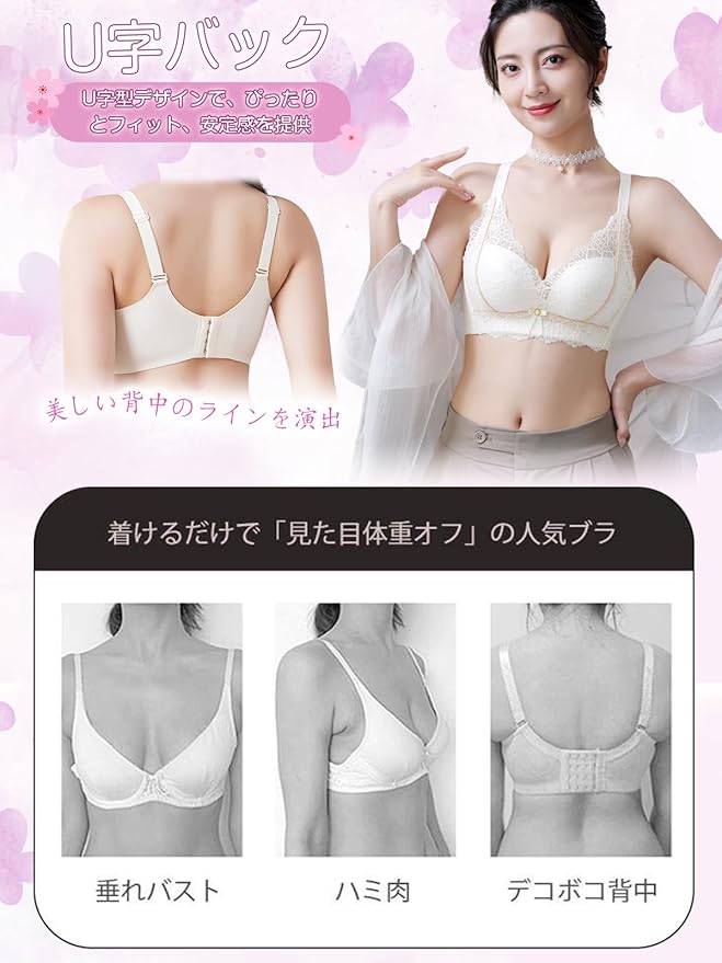 【補正ブラ・胸を小さく見せるブラ】:適度な厚みの立体カップがバストを持ち上げ、丸みのある美しいシルエットを形成します。大きなバストの女性にはよりコンパクトに見せ、小さめのバストでもハリのあるバストを簡単に演出できます。左右からバストをしっかりと寄せ、安定感を与え、効果が長続きします。大きいサイズブラ脇肉を中央に導いて自然な谷間を作り、カップの浮きやバストの垂れなどの問題を一気に解決します。