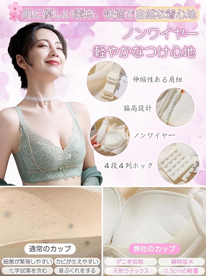 【脇高ブラ・着用しやすさ抜群】:ノンワイヤーブラ 大きいサイズは、脇高設計で余分な脇肉を収め、レースがバストを中央に包み込み、自然な谷間を作り出します。美しい丸みのあるシルエットは、胸が尖らないデザインを好む方にぴったりです。肩ストラップは幅があり、しっかりとバストをホールドしながら、肩への負担を軽減。垂れた胸補正ブラはバストの垂れを効果的に防ぎます。