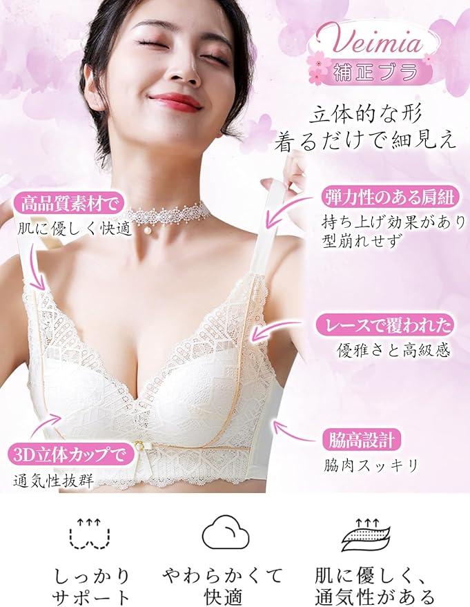【オールレース仕様・軽やかでエレガント】:veimia 小さく見せるブラレースブラは、可愛らしさとセクシーさを兼ね備えたデザインで、贅沢で繊細なレース素材を全面に使用しています。柔らかく繊細で肌に優しく、女性の本当の魅力を引き出します。シンプルなデザインが美しいラインを演出し、自信を高めてくれます。