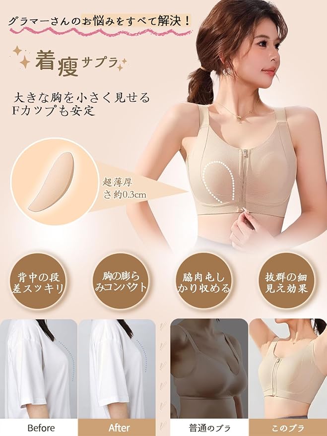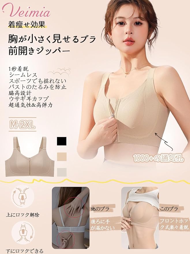 [veimia] 胸を小さく見せるブラ 小さく見せるブラ【 前ファスナーで1秒着脱・薄型パッド・1000+通気孔・安定感・見痩せ・脇高】 垂れ防止 シームレス 揺れない 前開きブラジャー 胸つぶしブラ 和装ブラ 肌への優し ノンワイヤー B-Fカップまで対応 | oioioichan