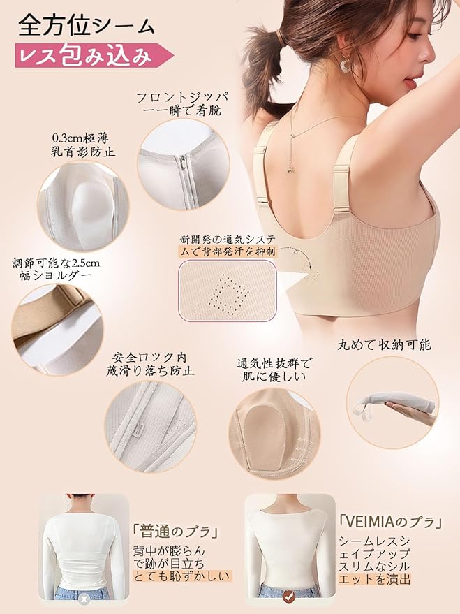 【前開き着痩せブラ・1秒で簡単着脱】従来の後ろホック式ブラジャーの煩わしさを解消!veimiaの前開きブラジャー 、前ファスナーで1秒着脱、簡単に着替えて小さくスリムな印象を演出!通常のブラ/フロントホックブラジャーより10倍速く、後ろ手でホックを探す必要がありません。妊娠中や肩・腕の動きがスムーズでない方、急いで着替えたい時にもぴったりです。