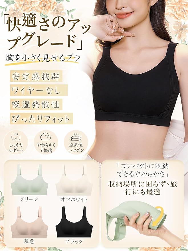 【一日中快適な着心地】この胸を小さく見せるブラ、着心地を重視するだけでなく、様々なシーンに応用できる。 シンプルでスタイリッシュなデザインは、日常生活中、職場着、大切な日のドレスなど、さまざまな服装に合わせやすく、あなたのエレガンスと自信を完璧にアピールできます。同時に、ヨガブラ、フィットネスブラ、ダンスブラ、スポーツブラ、小さく見せるブラ、授乳ブラ、和装ブラ、ナイトブラとして着用してもOK。