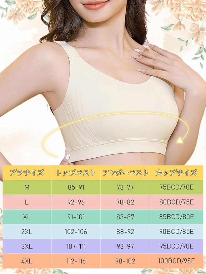 【女性バスト形態設計・美胸美背】シームレス小さく見せるブラが胸の段差による恥ずかしさを避けるだけでなく、トップ周径を効率的に減らす、着やせ効果のあるブラジャー。また、脇高ブラ サイドは脇肉集める仕様で脇肉がスッキリ!胸が小さく見せるブラ両サイト前にブラケット形状は、バストを真ん中に寄せ、横流れを防ぎ、Dカップでも激しい運動や寝るとき揺れない。更にバックは4列4バックルで調節可能、カップが歩かなくても安定感があります。