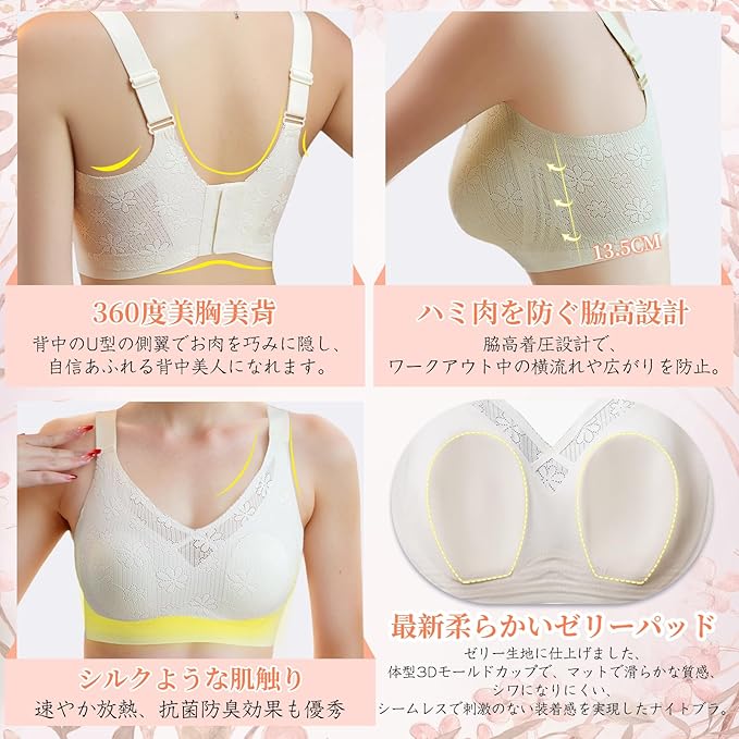 【揺れにくい安定感!蒸れ感を心配なさらず】シームレス小さく見せるブラの両サイトストレッチ素材がバストに強く押されたり痛んだりせず、全体的に適度な伸縮性があり、一日中着ていても息苦しくないブラジャー。女性バスト形態によって設計され、丸型、平型、セパレート型、たるみ型、大胸型、小胸型など、それに応じてサポートと調整を行います。強力なサポートのお陰で、安定した胸をサポートすることができ、大きな胸は圧迫感を感じないが、小さな胸が集まります。お肌が喜ぶスチールフリーのナイトブラです。