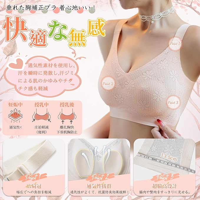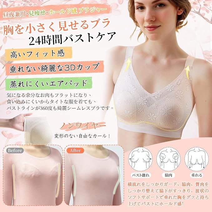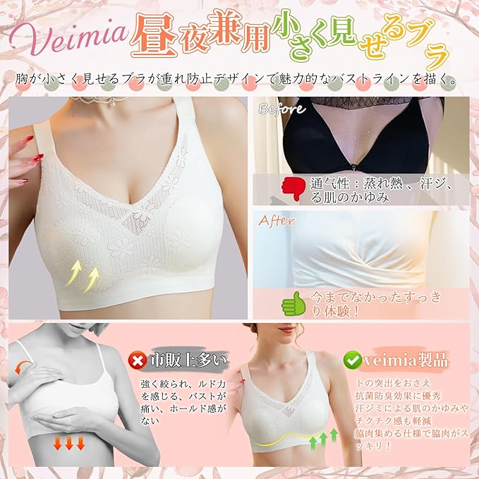【瞬間痩せて見え!昼夜兼用小さく見せるブラ】大きめの胸が強調されるのを防ぎためバストを小さく見せるブラが登場!小さく見せるブラ両サイドが魅力的な曲線を描く、革新的なウサギの耳の形状パッドは、ブラジャー自体の重量と厚みを軽減。より胸を小さく見せるようカップの膨らみは極限まで抑えつつ、自然で美しいバストラインを実現シームレス小さく見せるブラ。大きい胸の原因太って見える女性方がとてもオスス胸が小さく見せるブラ。