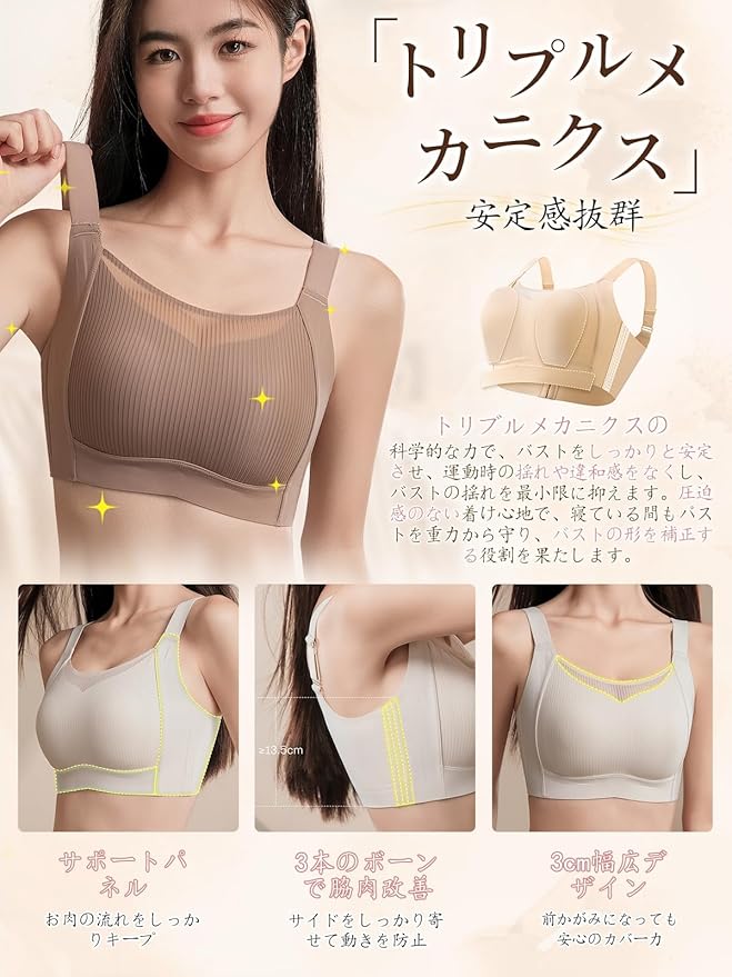 【三重安定感でホールド力抜群】肩ひも、アンダーバスト、背中の3点でしっかりサポート。激しい動きでもバストが安定し、ずれや揺れを軽減。毎日の動きを快適にサポートする「胸を小さく見せる ブラ」として、大きいサイズの方にも安心感を提供します。