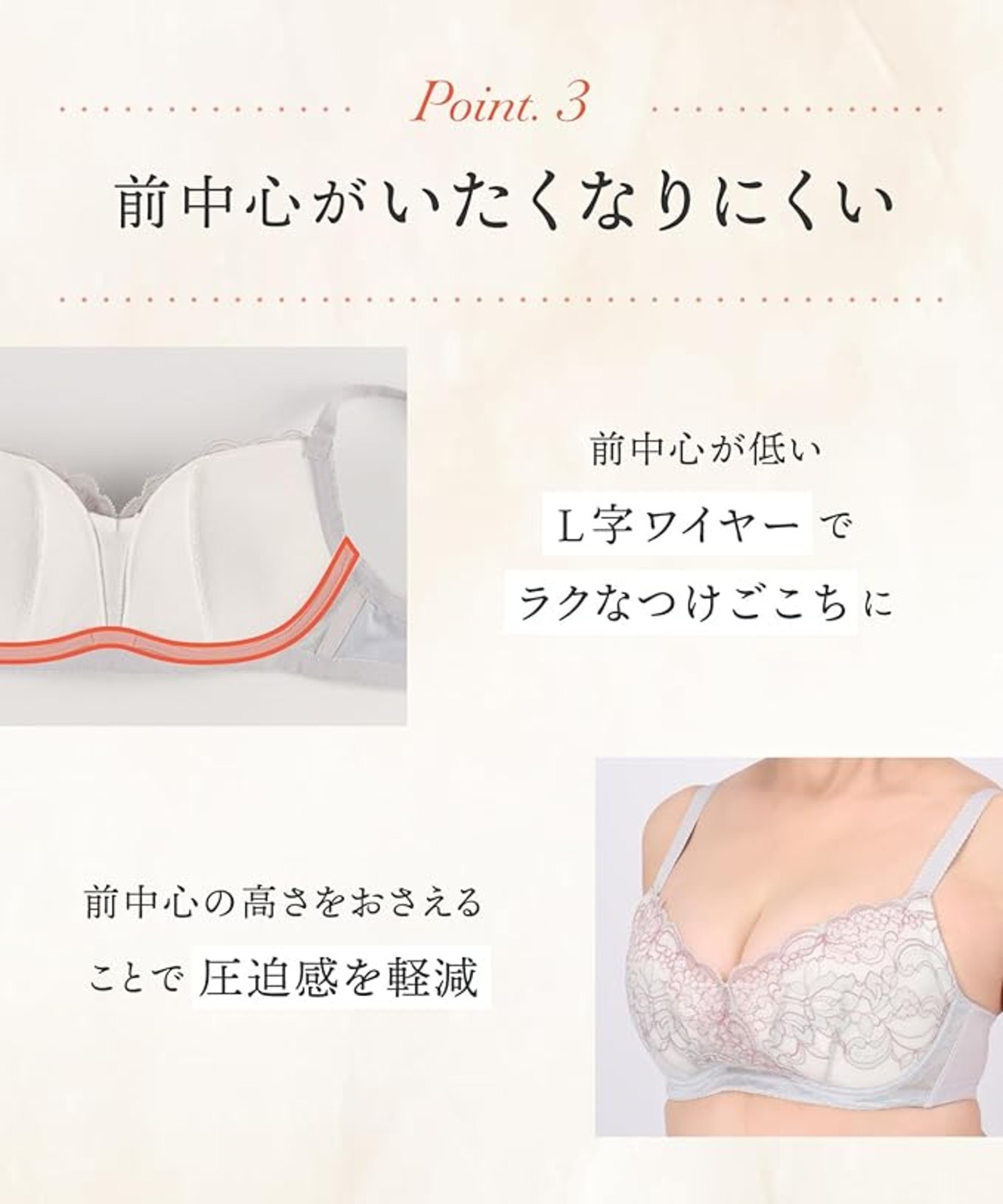 【前中心がいたくなりにくい】前中心の高さをおさえたL字ワイヤーで圧迫感を軽減