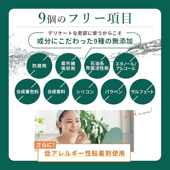 ⭐【9種*の無添加&低アレルギー性粘着剤使用】デリケートな患部に使うからこそ、成分にこだわった無添加処方。 *防腐剤、紫外線吸収剤、石油系界面活性剤、エタノール/.、合成着色料、合成香料、シリコン、パラベン、サルフェート