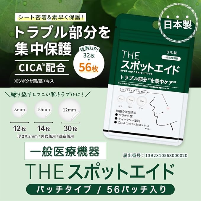 ※パッケージのデザインが異なる場合がございますが、商品の中身に変更はございません※⭐【トラブル部分を集中保護】CICA*配合!THE スポットエイド ニキビパッチ 56枚入り。一般。*ツボクサ葉/茎エキス
