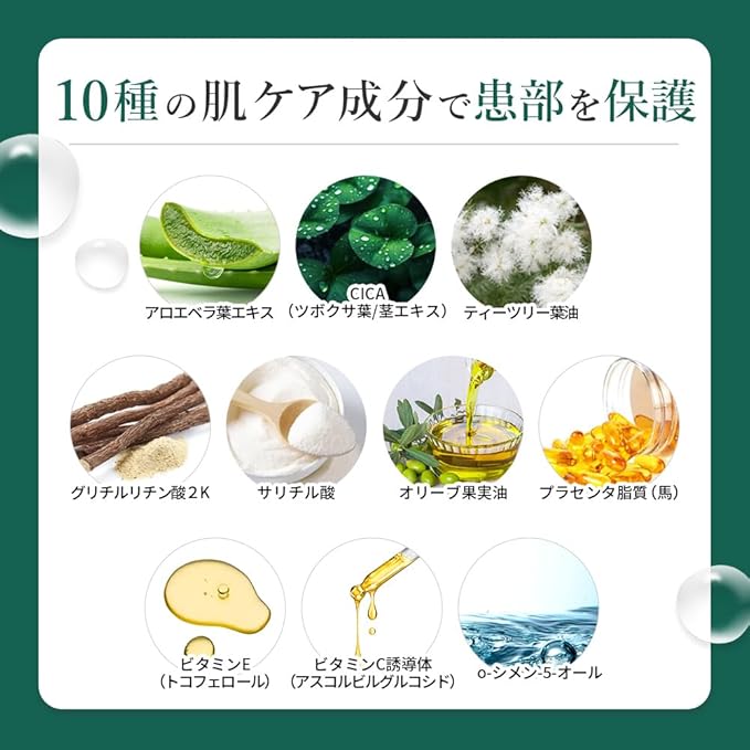 ⭐【10種の肌ケア成分*で患部を保護】*アロエベラ葉エキス、CICA(ツボクサ葉/茎エキス)、ティーツリー葉油、グリチルリチン酸2K、サリチル酸、オリーブ果実油、プラセンタ脂質(馬)、ビタミンE(トコフェロール)、ビタミンC誘導体(アスコルビルグルコシド)、o-シメン-5-オール