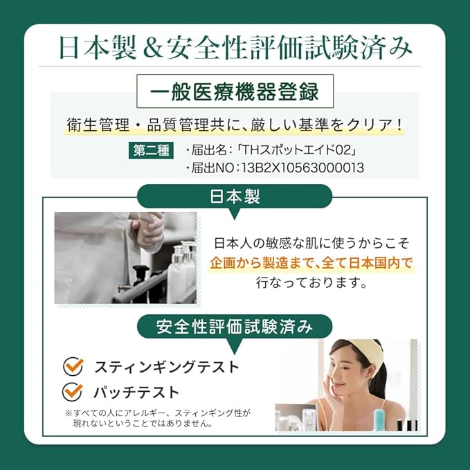 ⭐【9種*の無添加&低アレルギー性粘着剤使用】デリケートな患部に使うからこそ、成分にこだわった無添加処方。 *防腐剤、紫外線吸収剤、石油系界面活性剤、エタノール/.、合成着色料、合成香料、シリコン、パラベン、サルフェート