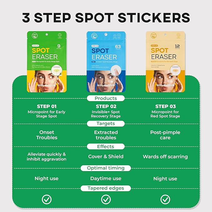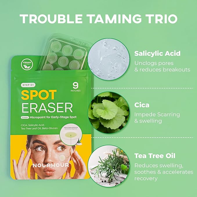 スポットイレーザーグリーンは、ボトルプールエキス、サリチル酸、ティーツリーオイル、Bグルカンなどからなるマイクロニードル(針)パッチで、特に初期段階のスポットに使用することがおすすめです。