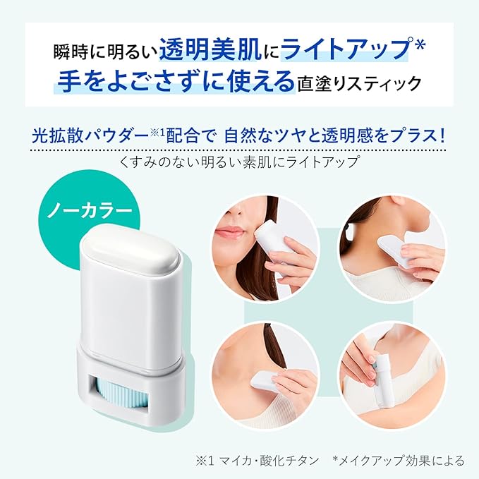 手を汚さずに直塗りOK。肌あれもケアできるライトアップUVスティック。するする伸びて、ムラなく均一に密着。うるおうのにさらさらな仕上がり。【ノーカラー】だからどんなパーソナルカラーでもナチュラルにライトアップできます。
