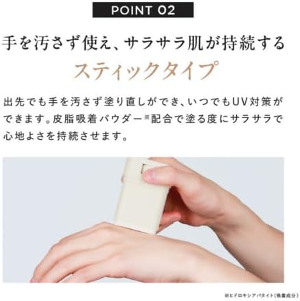 【手を汚さずに使えるスティックタイプ】 持ち運びにも便利で外出先でも手を汚さず塗り直しができ、手軽にUVケア。皮脂吸着パウダー*配合で、塗る度にサラサラ肌が続きます。 *ヒドロキシアパタイト(吸着成分)