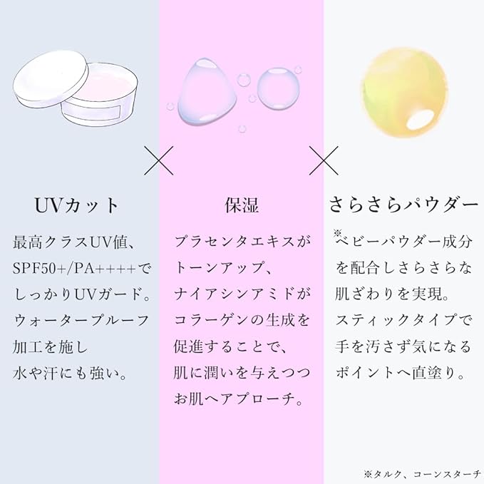 ✅【さらっとした使用感】さらさらパウダー配合でひんやりとした使用感。汗をかいていてもさらっと塗れて長時間UV対策。