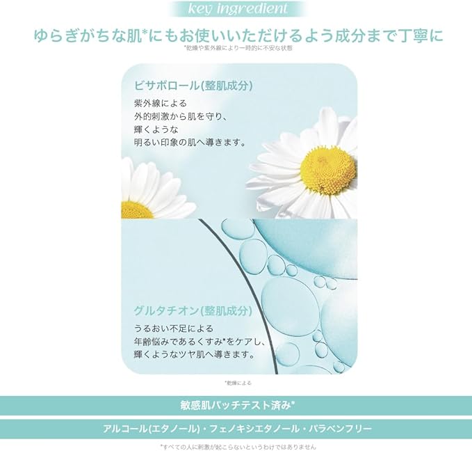 【デリケートな肌でも使いやすい成分】紫外線による外的刺激から肌を守り、明るい印象の肌へ導くビサボロール(整肌成分)やうるおい不足によるくすみをケアし、ツヤ肌へ導くグルタチオン(整肌成分)を配合。
