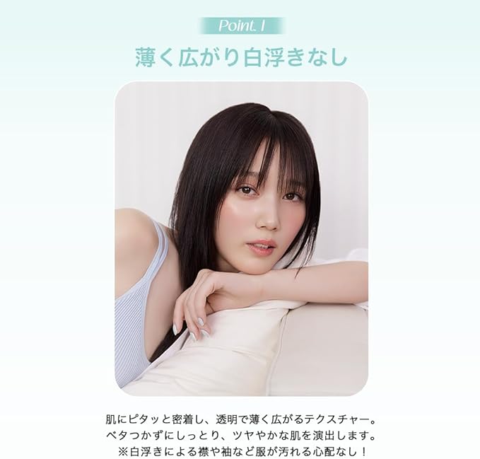 【薄く広がり白浮きなし】肌にピタッと密着し、透明で薄く広がるテクスチャー。べたつかずにしっとり、ツヤやかな肌を演出します。白浮きによる襟や袖など服が汚れる心配もありません。