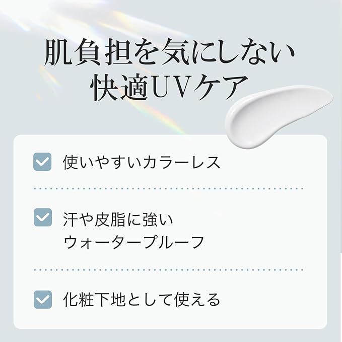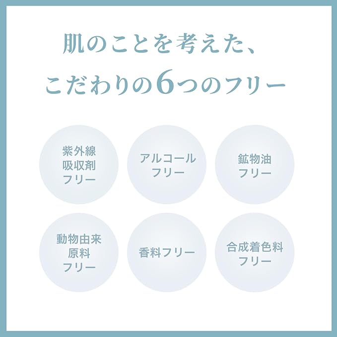 ✨6つのフリーで肌にやさしい:紫外線吸収剤、.、鉱物油、動物由来原料、香料、着色料は使用しておりません。6つのフリーで、肌にやさしい使い心地です。*アレルギーテスト済みなので、肌の弱い方にも安心してお使いいただけます。*すべての方に肌トラブルが起こらないというわけではありません。 ✨こんなときにおすすめ:☑毎日のUV対策に。☑ファンデの色を問わない無色下地として。☑スポーツやレジャーに。 ☑運転・自転車焼け対策で。