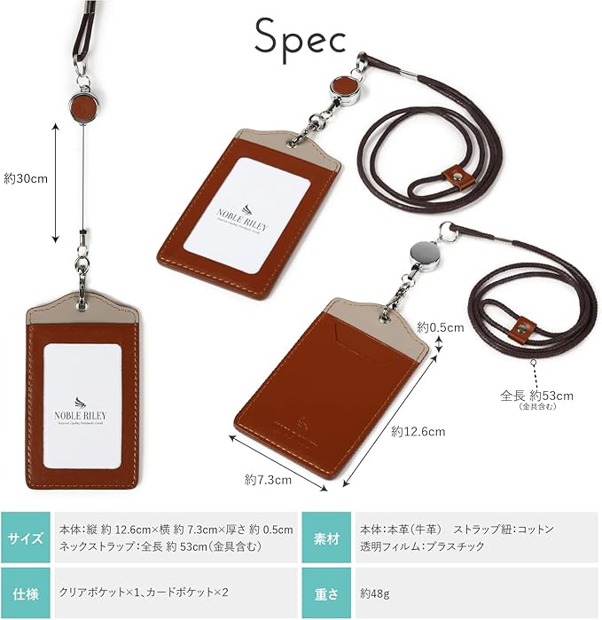 【Spec】 ◆素材 本体:本革(牛革) 透明フィルム:プラスチック、ストラップ紐:コットン ◆仕様 クリアポケット 1、カードポケット 2 ◆サイズ 本体:縦 約 12.6cm 横 約 7.3cm 厚さ 約 0.5cm ネックストラップ:全長 約 53cm(金具含む) ◆重さ:約 48g