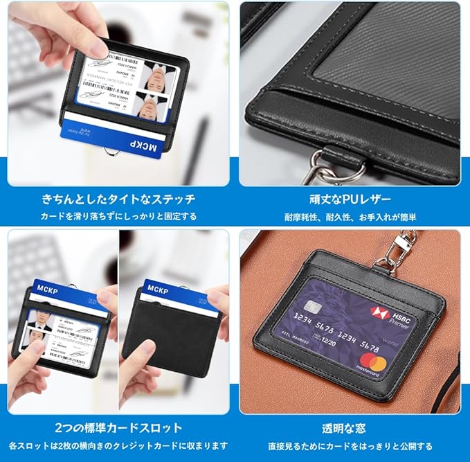 【横型IDカードケース】:良質なPUで作られ,手触りが柔らかい。丈夫で型崩れしにくく、使うほどにツヤが増し馴染みが出てきますので、IDカードホルダーのローエンド革と比較して、耐用年数が大幅に延長され、耐久性が向上しています。