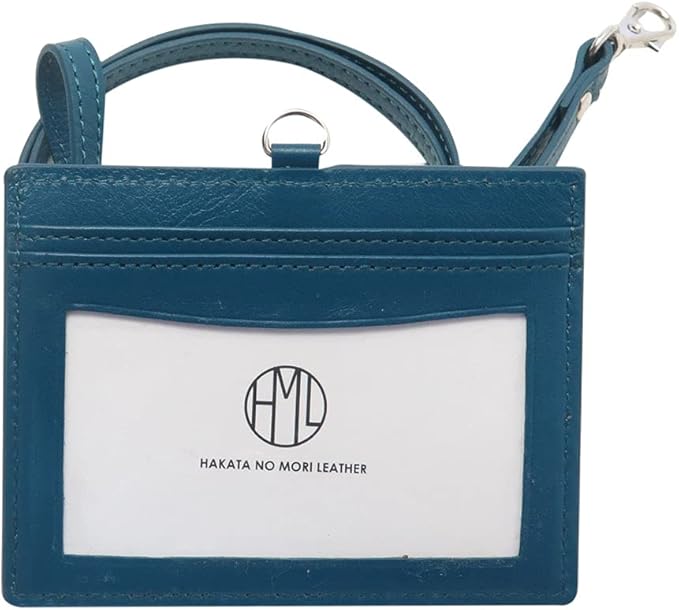 HAKATA NO MORI LEATHER 本革 両面 クリア IDカード ホルダー 透明 首掛け 2枚収納 横 ストラップ付き ケース 社員証 定期入れ 名刺 メンズ レディース (ピーコックブルー) | oioioichan