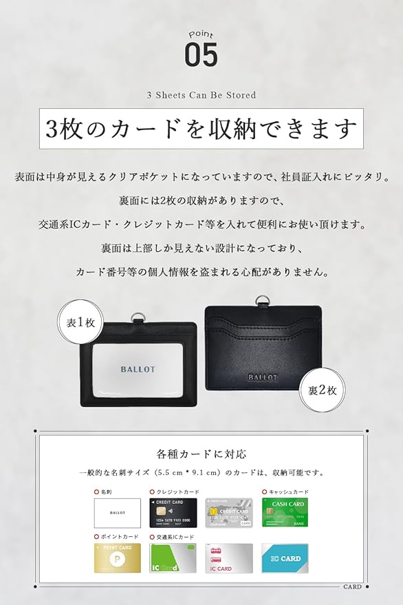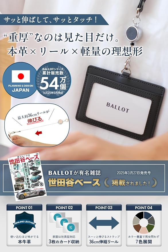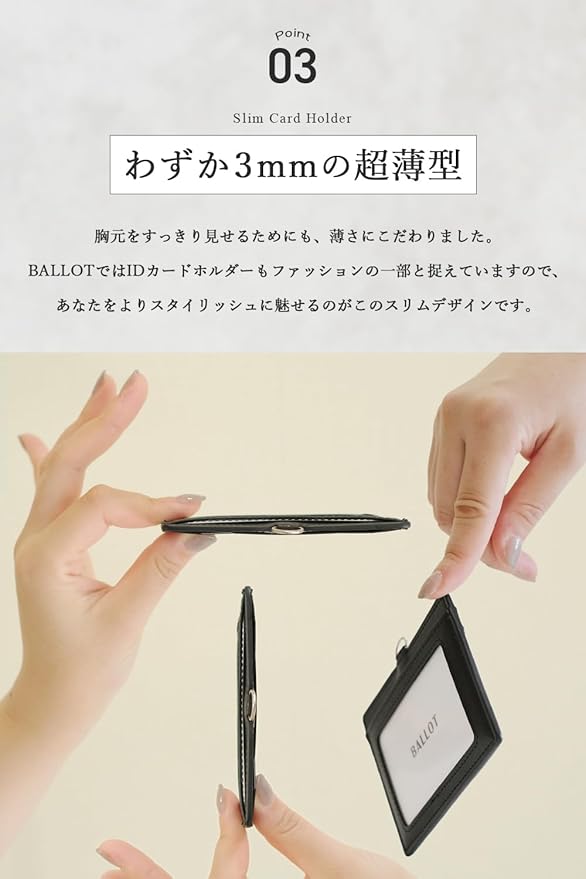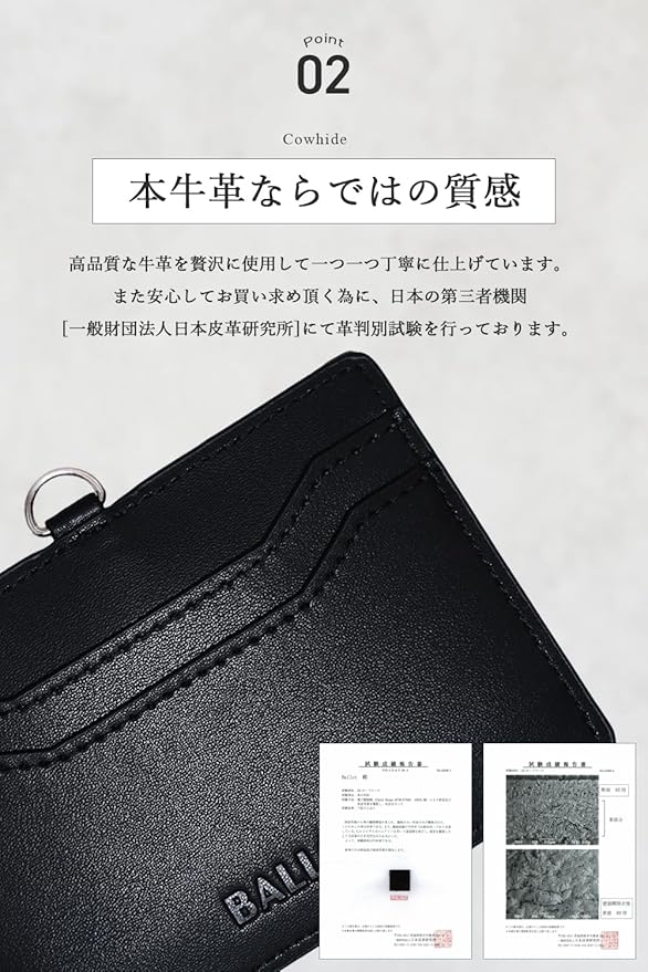 ✅【本牛革ならではの質感】BALLOTのIDカードホルダーは、高品質な本牛革を使用し、一つひとつ丁寧に仕上げています。牛革特有の滑らかな手触りと耐久性が特徴で、長く愛用していただける一品です。さらに、日本の第三者機関「一般財団法人日本皮革研究所」にて革の判別試験を実施しており、品質の確かさが.されています。洗練されたデザインと本革の上品な質感が、ビジネスシーンでの信頼感を演出します。