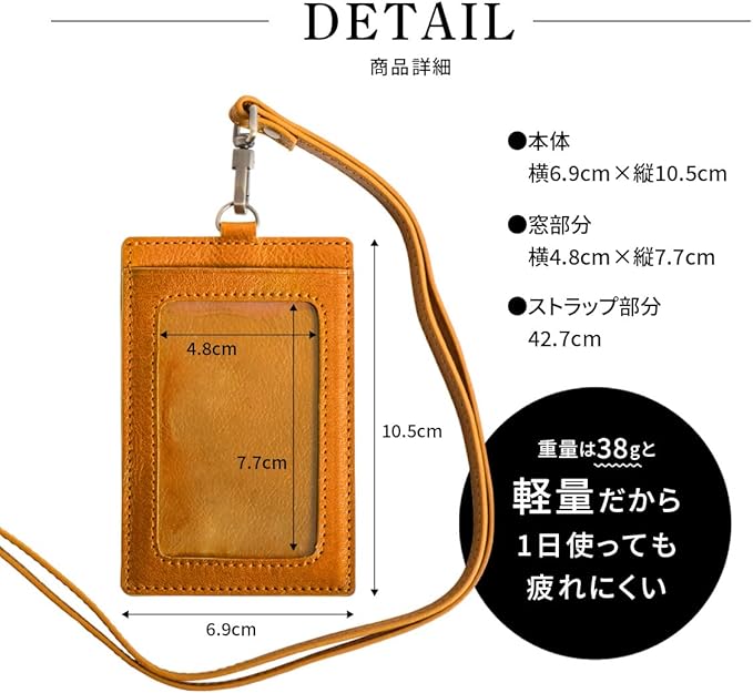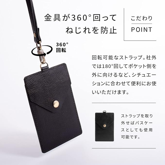 【シンプルで上品 さらに機能的】 ビジネスからカジュアルまで幅広いスタイルに合う上品なIDカードホルダーです。ネックストラップ付属で、IDカードや社員証、交通系ICにピッタリ。回転式の金具がねじれを防止し、お好みの向きで使えるこだわり仕様です。裏面の封筒型ポケットはカードだけでなく、名刺や小銭入れにも。
