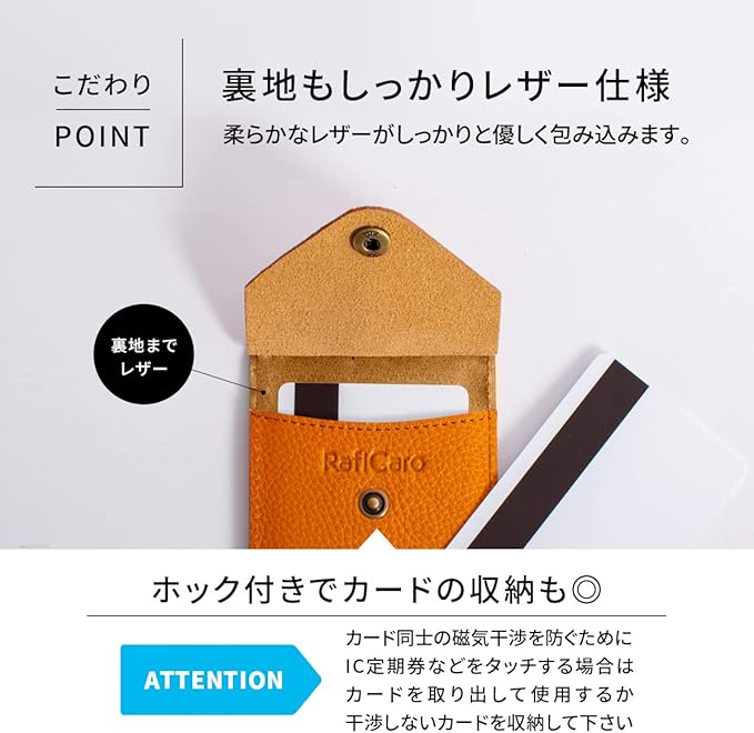 【スペック】 表 : IDポケット 1 裏 : フリーポケット 1 【サイズ】 ・縦 105mm 横 69mm 厚み 5mm ・重さ 38g 【素材】 ・本体:イタリアンレザー(本革) ・ストラップ外側:イタリアンレザー(本革) ・ストラップ内側:マイクロファイバー