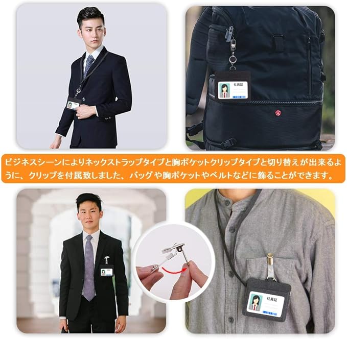 【利便性】ネックストラップ部とホルダー部を軽量の素材で作り込み驚異の47gという超軽量設計に致しました。長時間の使用を想定しておりますので、一層肌触りの優しい柔らかい革をネックストラップに使っております。朝から晩まで付けていても疲れにくくしております。ネックストラップを外せば、パスケースやカードケースとしても使えます。フフック式なので、取り外すことが便利で、自然に落ちにくい。普段はわざと気を付ける必要はなく、安心に使用できます。フックは360℃回転ですから、ネームストラップは捻じにくいです。ビジネスシーンによりネックストラップタイプと胸ポケットクリップタイプと切り替えが出来るように、クリップを付属致しました、バッグや胸ポケットやベルトなどに飾ることができます。落ち着いた色合い、どのような色の服でも主張しすぎず合わせやすいです。見た目も上品で清潔感を感じられ、好印象が与えられるのもポイントです!