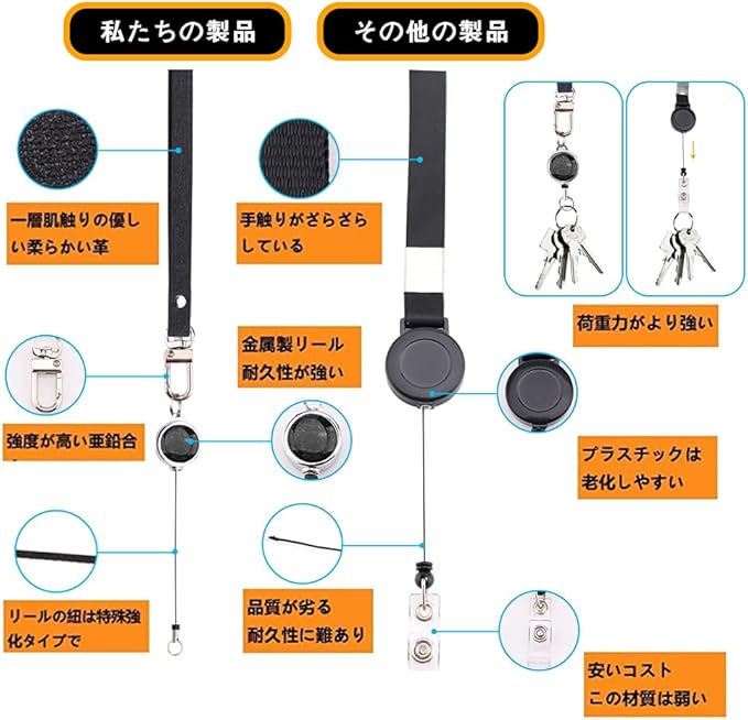 【上品な風合い、裂けにくて耐久性が強い】艶やかな光沢が美しい高級感溢れるIDカードホルダーです。手触りが非常にしっかり感じられ、堅牢度に感じられ、より安定しており、このパターンの耐摩耗性と耐圧性も大幅に向上しています。コバの仕上げは、天然ワックス素材を塗り、何度も何度も磨き上げ、しっかりと仕上げています。縫合をもっと補強してます 。各色は同じ色のステッチで構成されており、見た目も美しいデザインです。ネームストラップも同じ素材を使って作成され、細部までこだわります。丈夫で型崩れしにくく、使うほどにツヤが増し馴染みが出てきますので、他のローエンド革と比較して、耐用年数が大幅に延長され、耐久性が向上しています。カードホルダーは、紐とケース部分の継ぎ目が一番劣化が早いですが、本商品はとても頑丈です。強度が高い亜鉛合金を採用しました、細部までこだわいります。金属製リールはほかより耐久性に優れているので、長年使うことが出来ます。窓フィルムはPVC素材で、クリアな透明感なのでカード情報は一目瞭然のネームホルダーです。革製なのでプラスティックのカードケースよりカードの保護に不安があります。