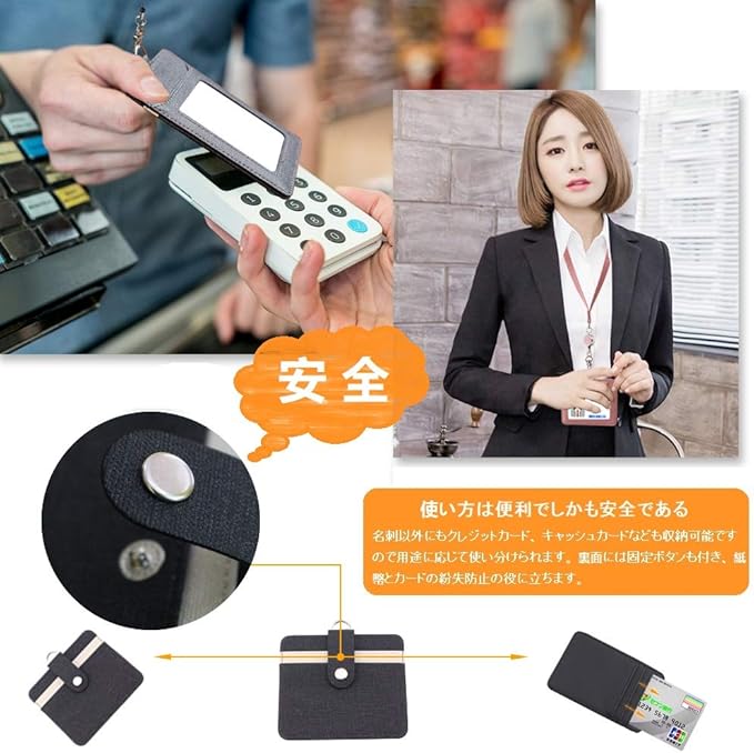 【両面用ポケット】近年さまざまなカードが増えてきている。定期券をはじめ、ICカード、IDカード、ポイントカード等多数。その中でも特に定期券・ICカードは通勤通学で毎日使用する、いざ使用するときにバッグからすぐに見つからないと焦ってしまうし、手間になる。駅構内で混雑の中手に持つのは落としてしまいそうで怖い、と等いう方に是非オススメの商品が登場。カードを探す時間が省かれ、スマートに行動することができます。 表面・中仕切り・裏面の三層構造になっており、片面ポケットのケースより、この両面ポケットタイプはカードをもっと多く収納できます。裏面には固定ボタンも付き、紙幣とカードの紛失防止の役に立ちます。名刺を入れておけば、不意の来客の時でもすぐに取り出せ、とても便利です。もちろん、名刺以外にも、なども収納可能ですので用途に応じて使い分けられます。このデザインは非常に実用的で、少なくとも3枚のカードを収容できます。機能的ではあるが、非常にコンパクトであり、厚みを占めないため、ポケットの安全を妨げることはない。