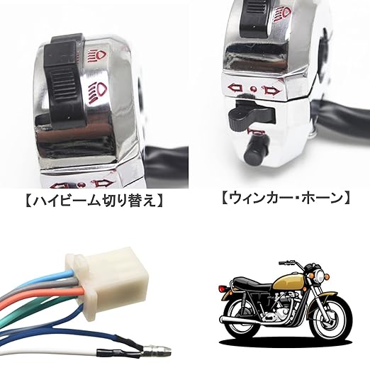バイクに乗車中に左手で操作するスイッチをまとめたバイクハンドルスイッチセットです。ウィンカー(押し戻し式)、ホーン、ロービームとハイビームの切り替えができます。