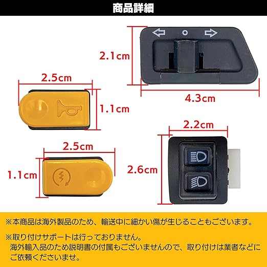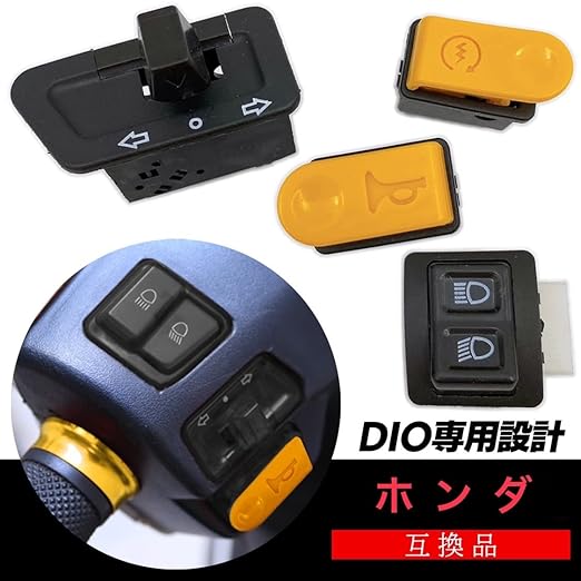 純正タイプの社外品でホンダ(HONDA)ディオ(DIO)に取り付け可能なハンドルスイッチになります。ウインカー・ホーン・ライト ハイロー(high-low)・セルスイッチの4種セットだけでなく、 それぞれ単品での販売もしています。