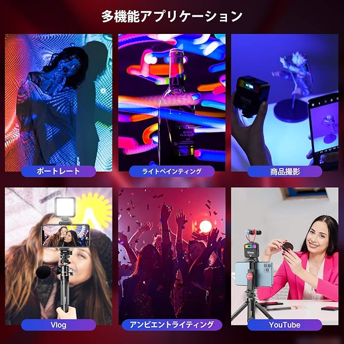 【適用場所】クリエイティブな映像作品の補助光に使えます。例えばモデル撮影、静物撮影、明るい個人写真、tiktok、ユニークな動画。LCDディスプレイは、0-359色を素早く選択することができ、0-100%で明るさをコントロールすることができます。