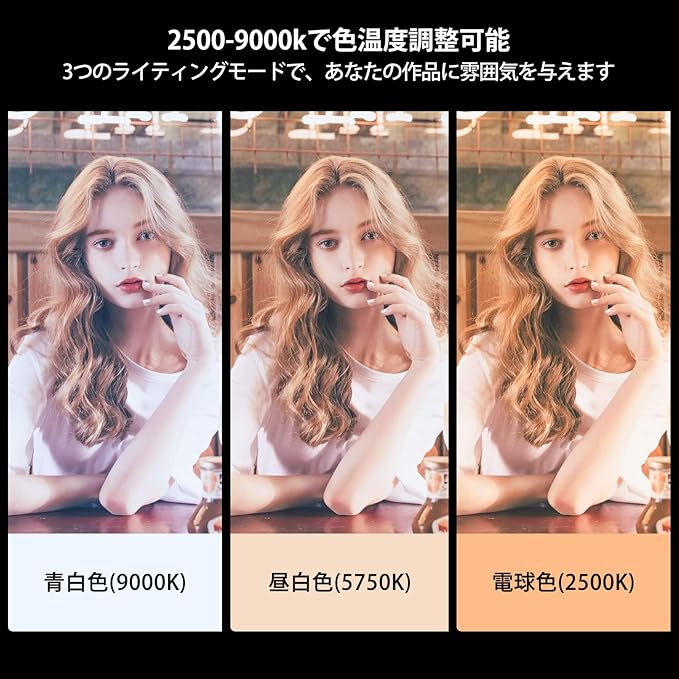 【無段階調光&色温度自由調節】明るさを0%-100%で無段階で調光できます。2500-9000の範囲で色温度を調整することができるため、さまざまな環境での撮影に対応することができます。CCTモード、RGBモード、特殊モードがあります