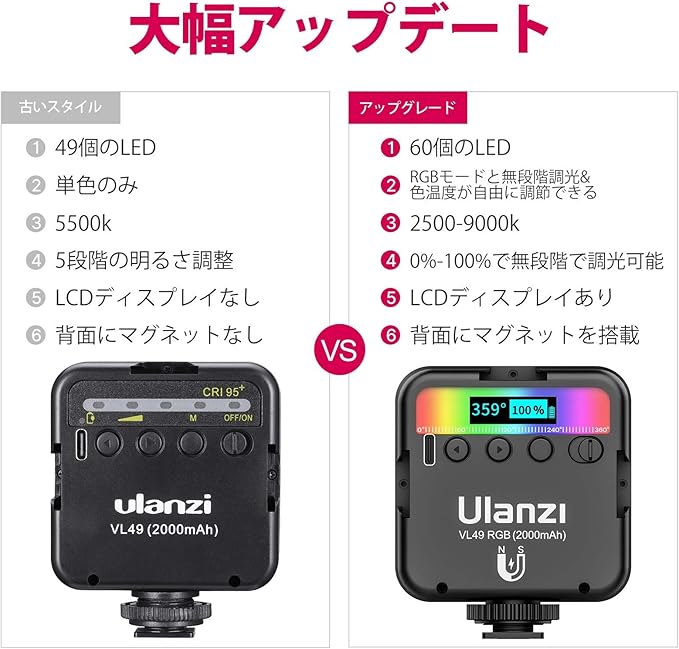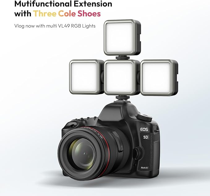 【改良版】VL49のアップデート版、背面にマグネットを搭載し、あらゆる場面で使用することができます。コールドシューを三つ搭載しているので、ニーズに合わせて、マイクやビデオライト等を同時に取り付けることができます。