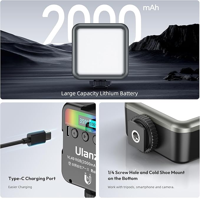最新 Ulanzi VL49 RGB撮影ライト+三脚付き LEDビデオライト 卓上スタンド 359色RGBモード 明るさ調整が可能 9000k明るい白色光 2000mAh USB充電式 iphone/Gopro/Osmo Pocket/Samsung/Nikon/Canon/Sony/アクションカメラに適用 | oioioichan