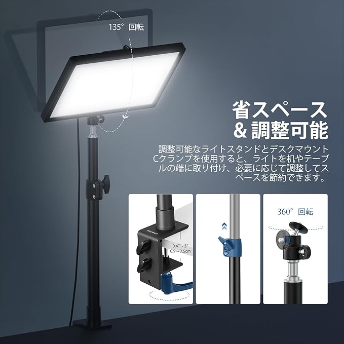 【省スペース&柔軟調整スタンド】ファンレス静音ライトはボールヘッド付き卓上スタンドを備え、26.8 18.8 3.7cm超薄型設計で狭い卓上スペースにも簡単固定し、角度や高さを微調整できます。623g軽量ボディながら安定性に優れ、自宅スタジオやリモートワーク環境に最適です。