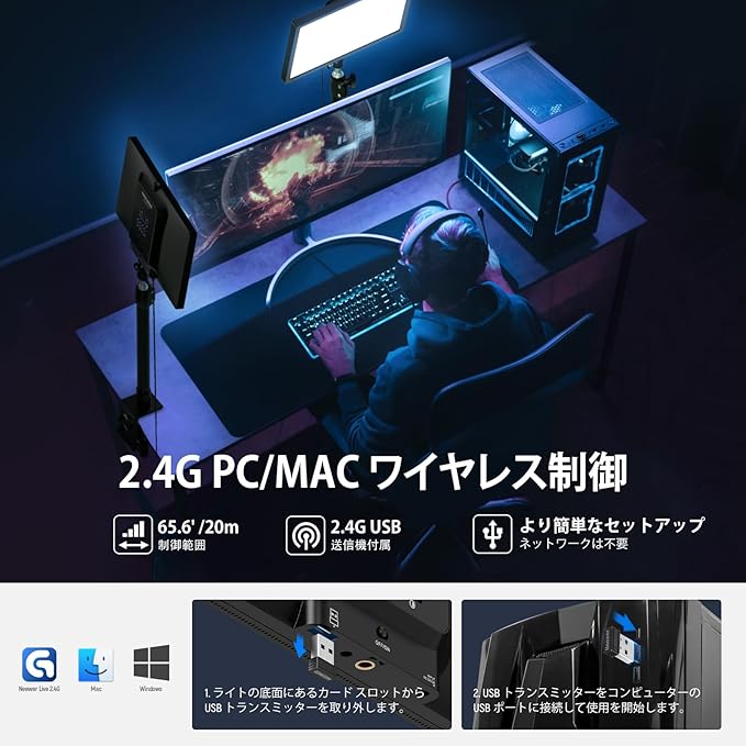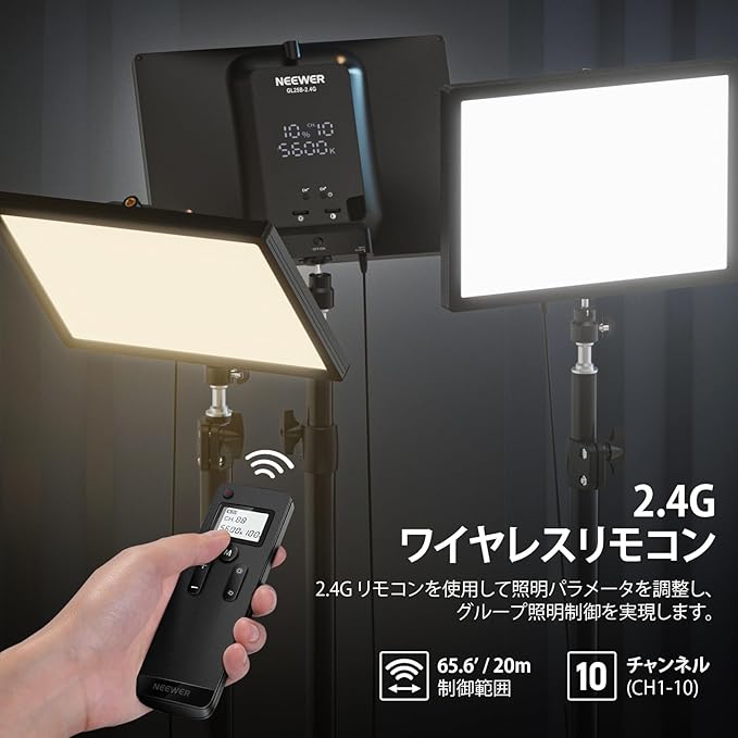【2.4Gリモコン&マルチデバイス制御】LEDパネルライトは本体ボタンまたは付属したRT100 2.4Gリモコンで無線操作でき、USB送信機をPC/Macに接続し、専用アプリ「NEEWER Live 2.4G」で複数台のライトを一括管理可能で、オフラインも動作します。GL1/Pro/C、BH40B、RPシリーズ、T140 NL1920/660/480-2.4G、CL124-2.4Gなど他のNEEWERライトとも適します。